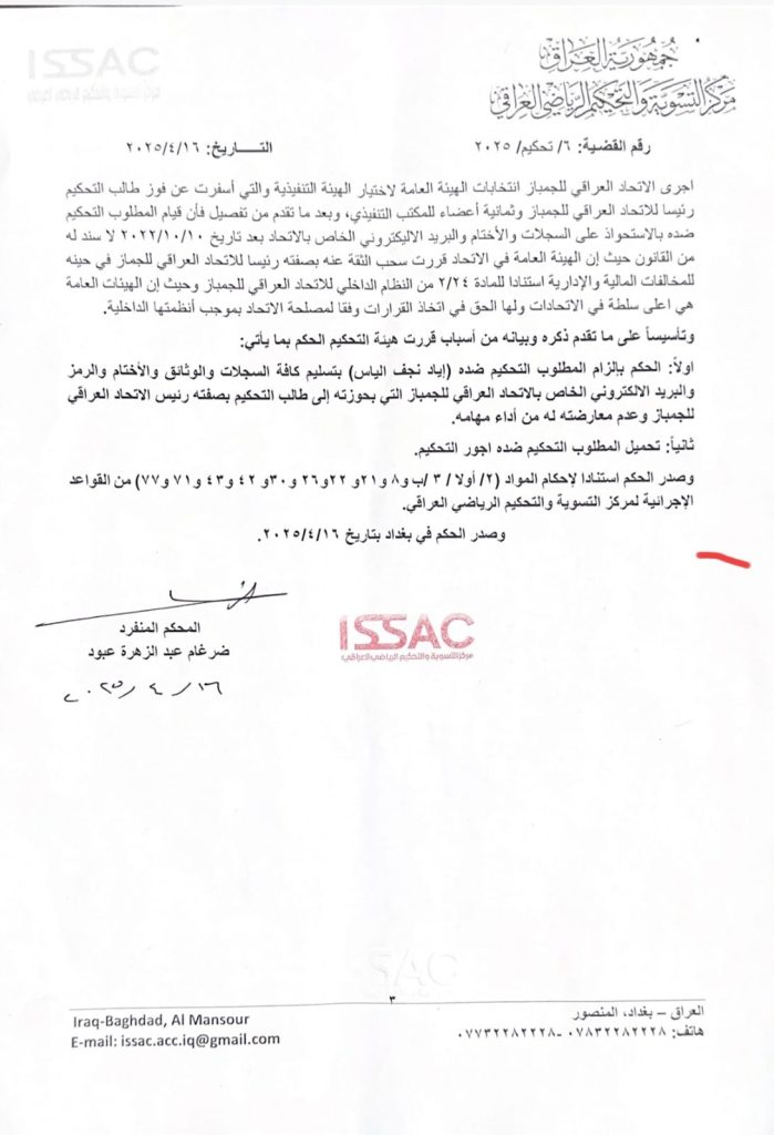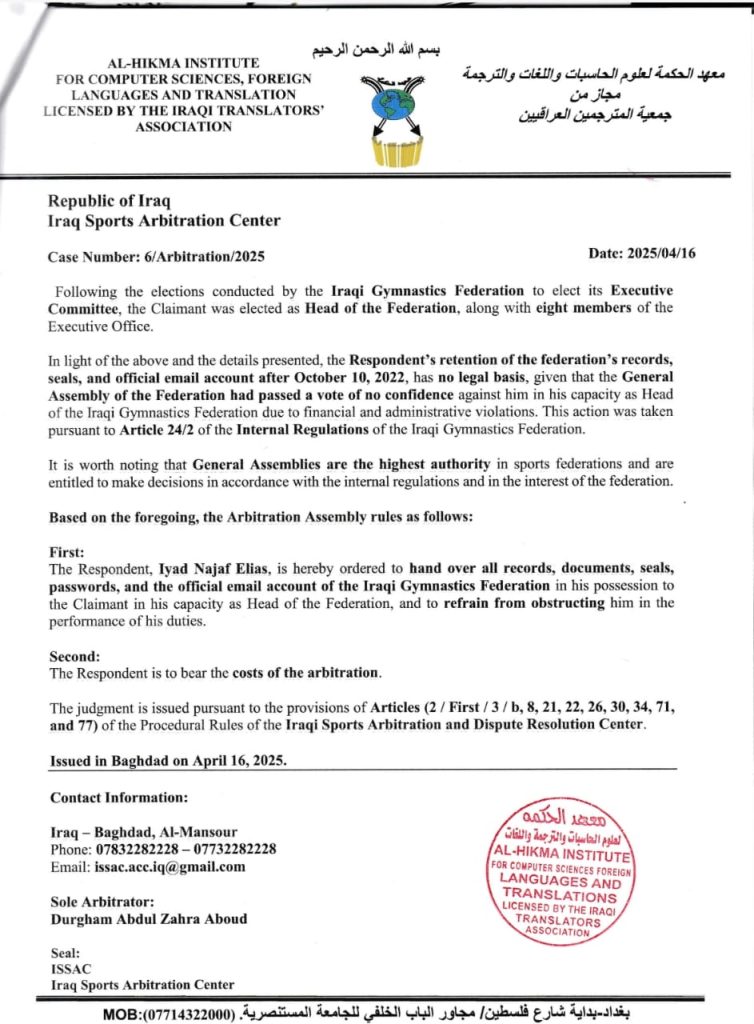 An important decision from the Sports Settlement and Arbitration Center regarding the Iraqi Gymnastics Federation.