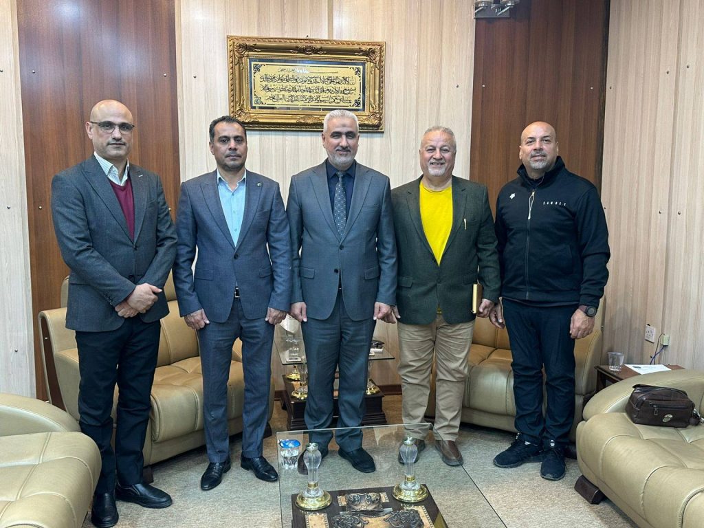 Today, a delegation from the Iraqi Gymnastics Federation, headed by Eng. Walid Al-Saadi, his deputy Dr. Amer Sakran, and a member of the technical committee, Mr. Amjad Al-Sawad, met with the Dean of the College of Physical Education and Sports Sciences at Al-Mustansiriya University, Dr. Hussam Al-Momen.